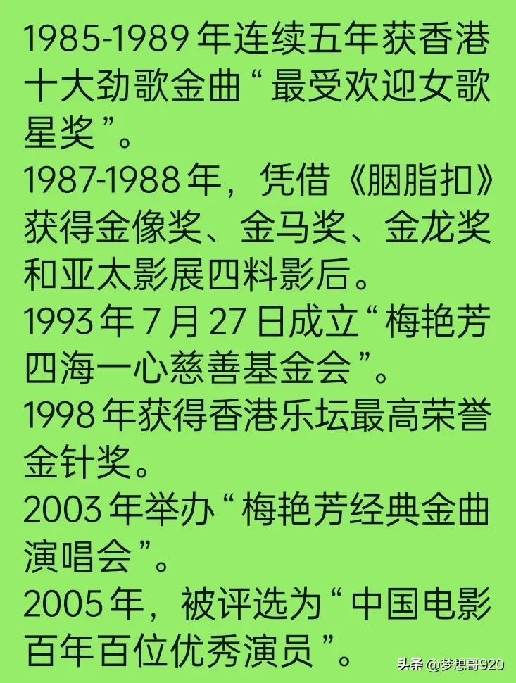 梅艳芳一生获奖无数,音乐,电影,电视都取得巨大成就。每次新唱片发售,每次演唱会开唱,刘德华再忙也必定到场助阵。