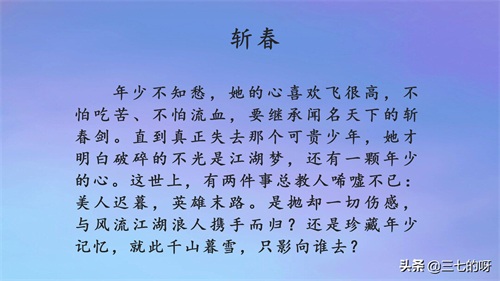 她表白被拒,还惨遭奚落,而这所有的狼狈都被他尽收眼底,之后他和她勤学苦练,潜心修炼,争夺斩春剑继承人的位置。年少轻狂的一腔热血,还有对梦想的执着坚持,故事的情节很新颖,完全不按常理出牌,看完很惊喜,强推!