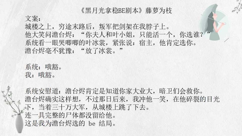 十一、《黑月光拿稳BE剧本》藤萝为枝 35万字 BG 连载中