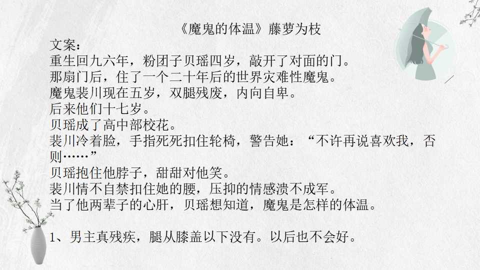 《魔鬼的体温》校园救赎文,女主重生后与男主相识,变成男主小太阳救赎的故事。男主裴川自卑深沉,前半生遭遇让人心疼,童年一直活在其他人的嘲笑中,男主的父母对待孩子的方式是典型的反面教材。女主贝瑶包容坚定,带给裴川温暖,男主对女主的爱,大概就是“我身在黑暗,却心向光明”。小说总体玻璃渣里找糖,甜里带虐。