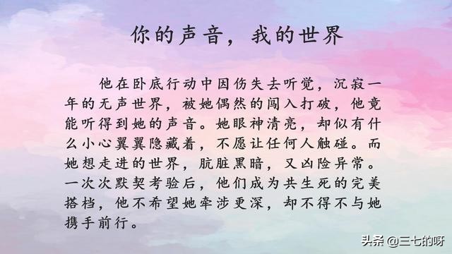 因为这个原因,女主以身涉险想寻找真相,成为一名缉毒警察,男主在执行任务中受伤,耳朵的听力受损,在修养期间遇到了女主。男主和女主是同道中人,两人都为了正义深入龙潭虎穴,搭配的很默契,男主后来听力也在慢慢恢复。