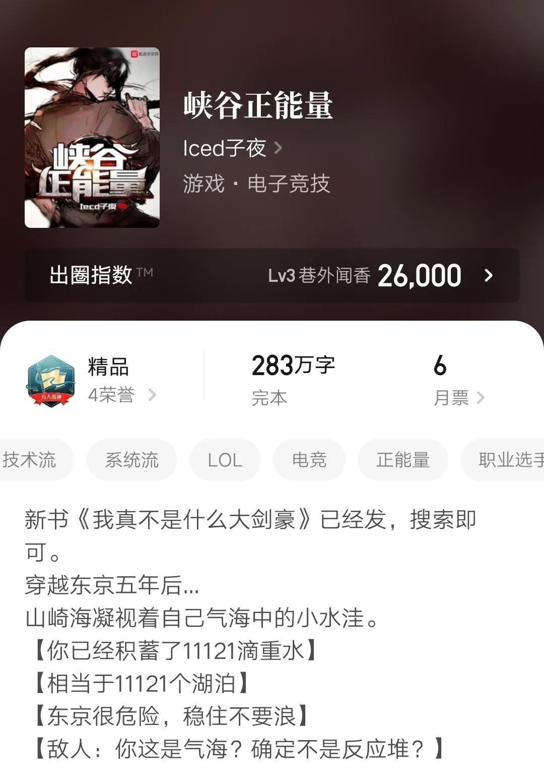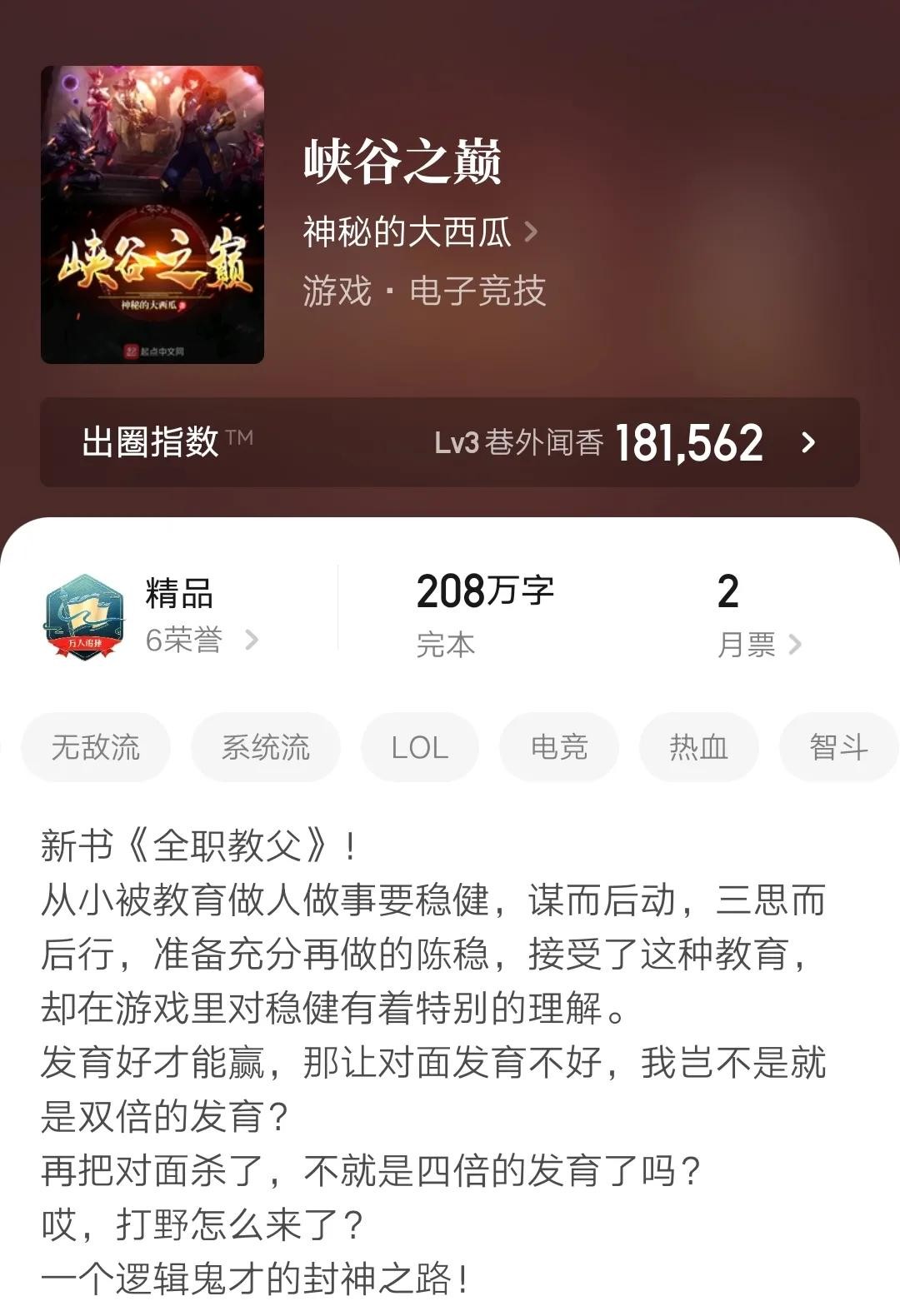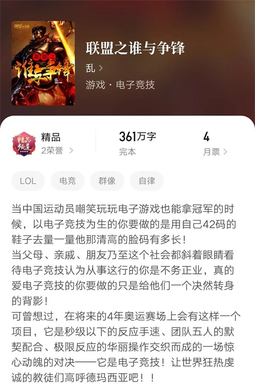 网文界有句老梗“乱写的都好看”说的就是这本书,这本作为写英雄联盟的小说里最早的一批,可以说是开创了联盟小说的经典套路了。