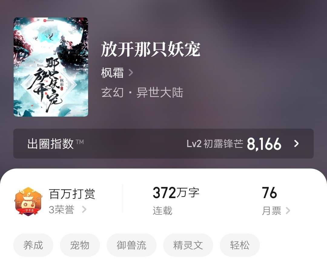 很好看的宠物流的小说了。这本书一口气看下去就特别的爽,而且不拖沓,读起来和斗罗大陆有点相似,但比斗罗大陆要更爽,而且读下去就会发现很多剧情都是有关联的,一个连着一个,剧情环环相扣,非常想让人一口气读下去,比较钟情的御兽流。
