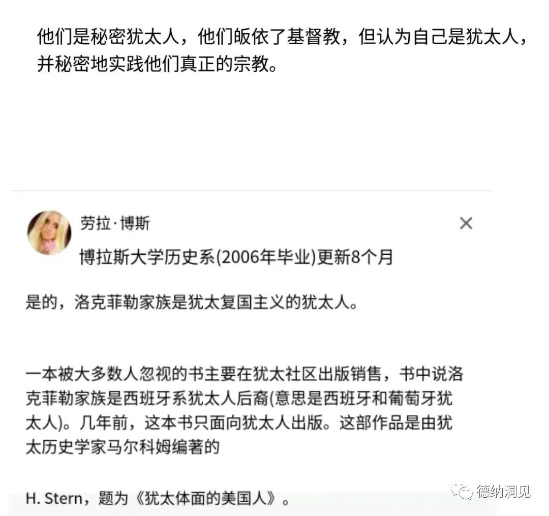 洛克菲勒家族是秘密犹太人。有些犹太人甚至改信基督教,但他们只是表面信奉基督教,背地里依然信奉犹太教,后来西班牙管这种犹太人叫marranos(秘密犹太人)。比如洛克菲勒家族就是秘密犹太人。