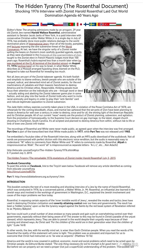 美国作家兼编辑小沃尔特·怀特(Walter White)根据对美国纽约州参议员雅各布·贾维茨(注:雅各布应该是个犹太人常用名)的犹太人行政助理哈罗德·华莱士·罗森塔尔(Harold W. Rosenthal 1947年11月2日—1976年8月11日)进行了一次高度机密的有偿采访,所形成的现场录音谈话文字稿内容,泄露了许多犹太人不宜也不愿对外界非犹太人可以公开的秘密。