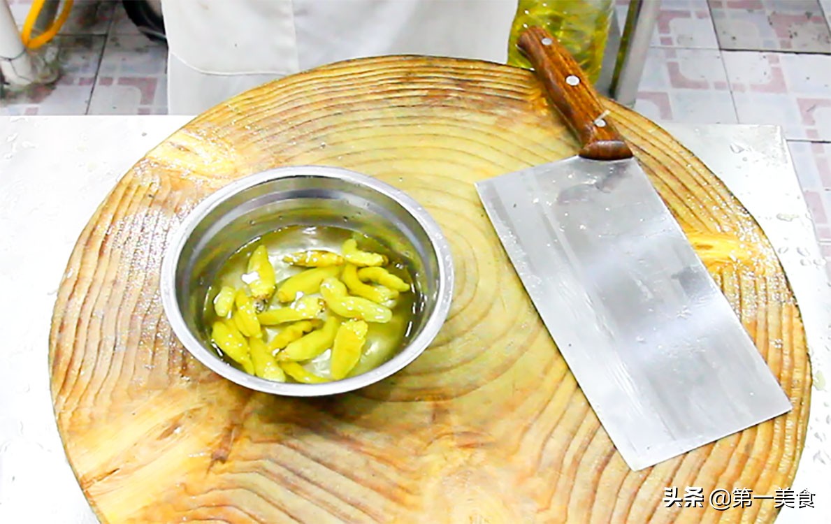小米泡椒一把,连同泡椒水倒入盆中备用。