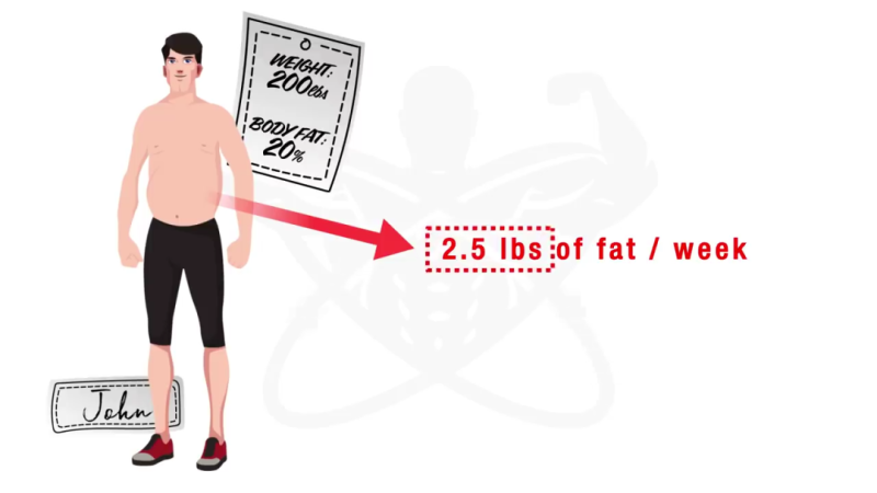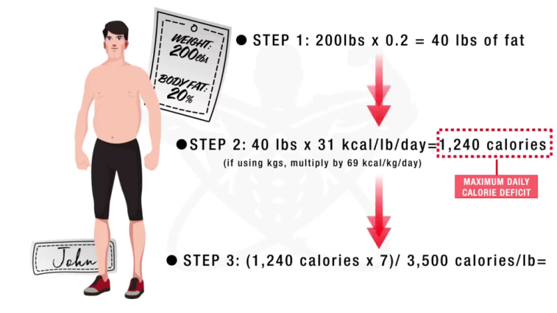 例子:1名体重为200磅的成年男性,他的体脂率是20%,那么他体内脂肪的重量就是40磅。我们用40磅×31(1磅脂肪每天所消耗的热量),算出该男子脂肪每天所消耗的热量为1240大卡。在这之后,我们套用公式。先算出该男子体内脂肪在一周内所消耗的总热量,然后将其÷3500(每磅脂肪一周所消耗的热量),算出他每周可以减掉2.5磅的脂肪。