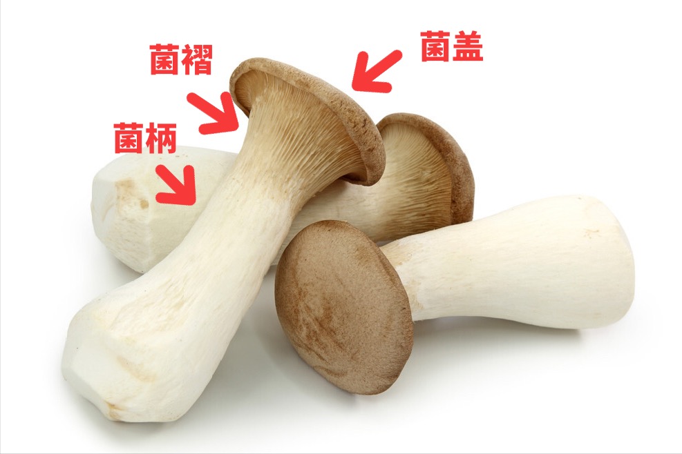 如果大家仔细观察杏鲍菇的外形,就会发现其主要由3个部分组成,分别是菌柄、菌盖和菌褶,如下图: