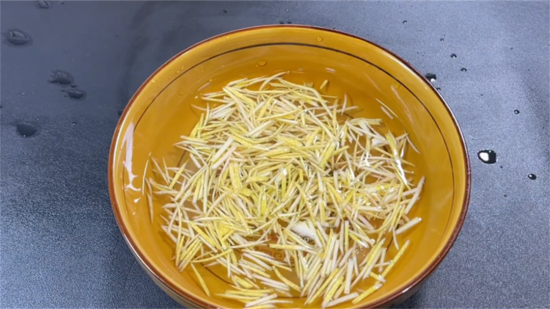 5、接着把柚子皮切成细丝,放入碗中,加入一小勺盐,加入清水浸泡10分钟,经过浸泡以后,可以去除一些苦味,更干净。