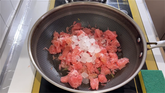 7、煮好以后,把柚子皮放到锅中,放入500克柚子肉,250克清水,250克的冰糖。开中火开始熬制,把汤汁熬制粘稠。