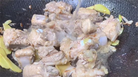 2、起锅烧油,放姜片大葱,开大火翻炒均匀,炒出香味,再放入排骨,继续开大火翻炒,炒至排骨变色,炒至两面金黄。