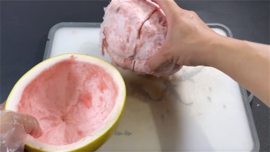 2、然后用刀从中间轻轻地划开,不要伤到果肉,划一圈以后,用手轻轻地推,柚子皮就轻松取下来了,另一半同样如此操作。