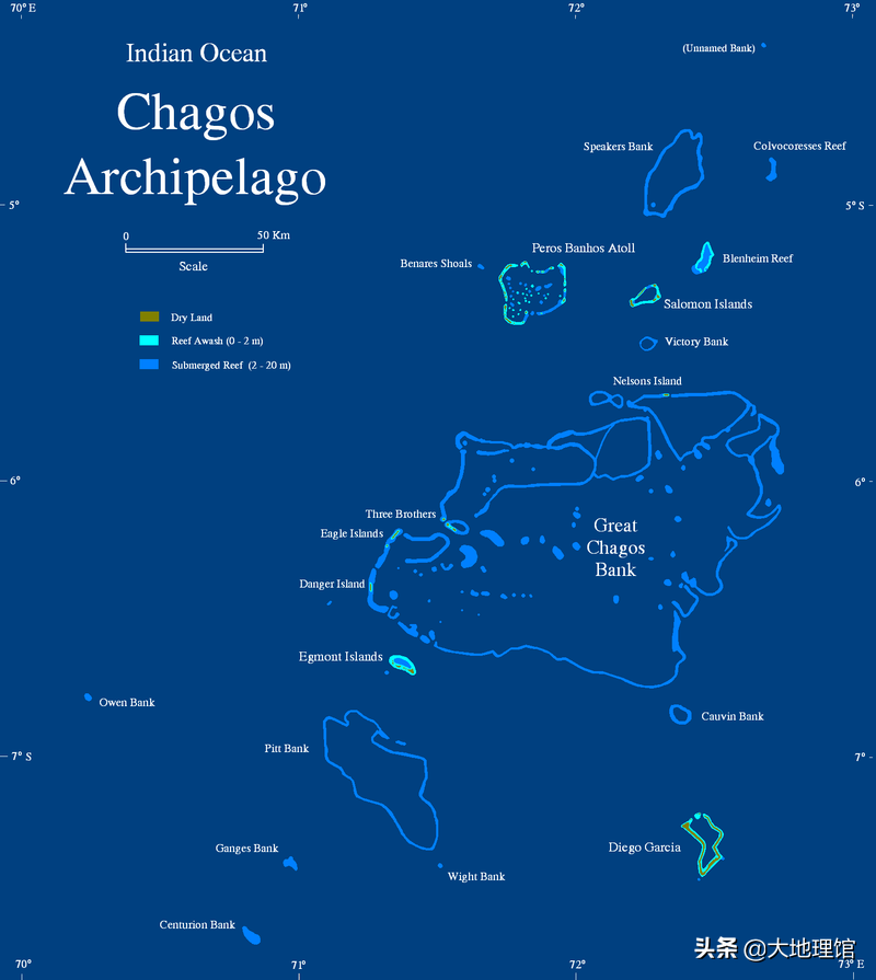 【最大的环礁——查戈斯大浅滩】是印度洋的环礁,位于马尔代夫以南约500公里,属于查戈斯群岛的一部分,由英属印度洋领地负责管辖,由7座岛屿组成,长150公里、宽100公里,面积4.5平方公里,潟湖面积12,642平方公里,是全球最大的环礁。