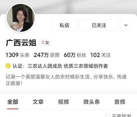 关注过云姐的应该都知道,云姐在广西三农自媒体圈子里,虽然还称不上顶流,但是也算是头部了,虽然云姐的粉丝只有60万左右,和巧妇九妹,小六视野他们比起来,是有一定差距的,但是广西云姐的视频播放量反而比他们高,铁粉比较多,粉丝粘性也比较强。