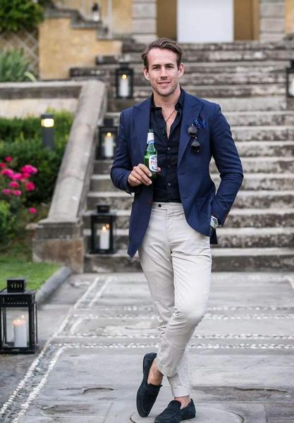 商务休闲风格还是要以西装上衣为主,但不需要像商务正装那样采用成套的搭配 你可以用牛仔裤 圆领 线衫 甚至T恤进行搭配