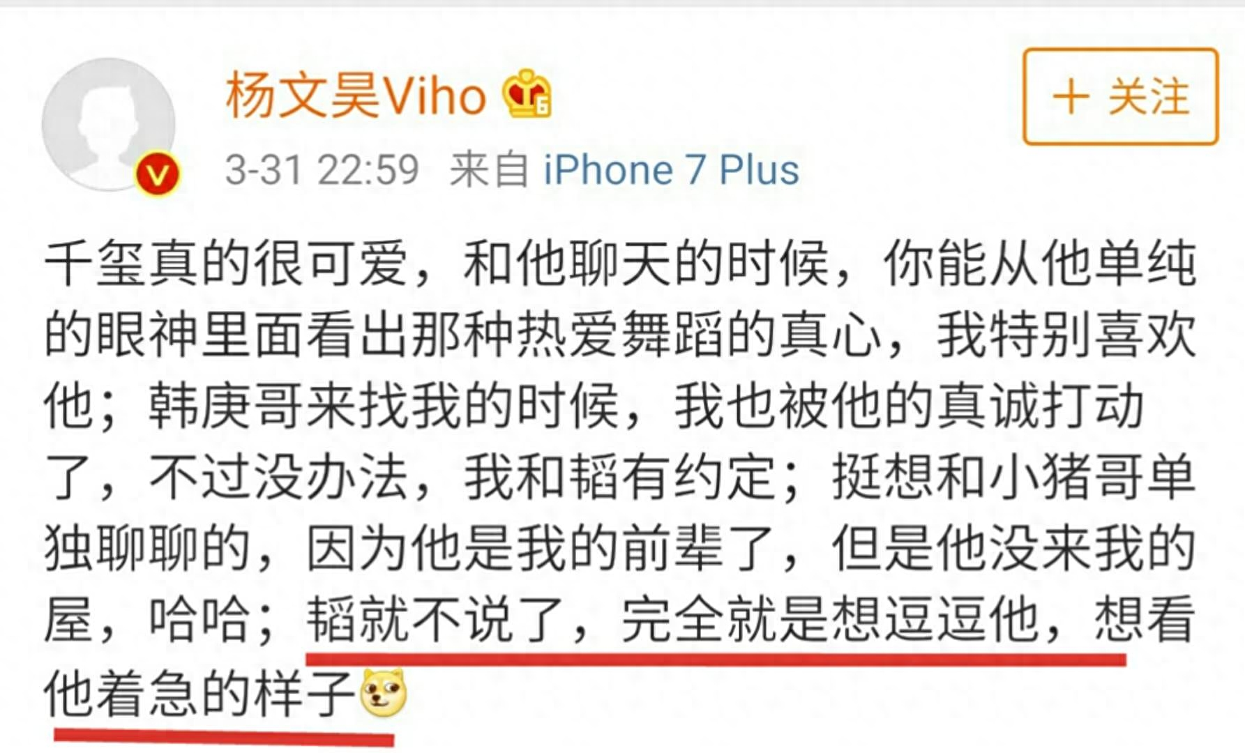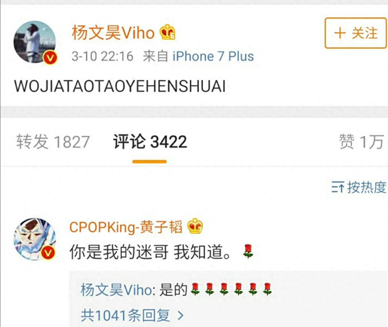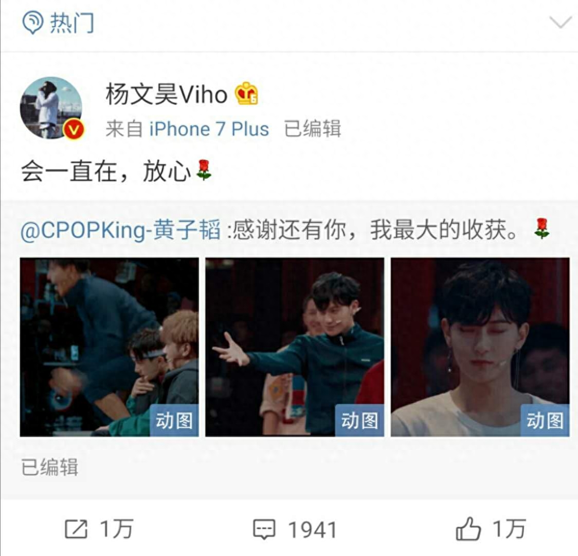 100进49时,通宵录制,黄子韬昏昏欲睡,直到杨文昊上场,韬韬彻底活了过来,并在微博表白“感谢还有你,我最大的收获”,而昊昊则贴心回应“会一直在,放心”,两句真心话旁边都点缀着红玫瑰。好啦,我们知道你们相亲相爱。