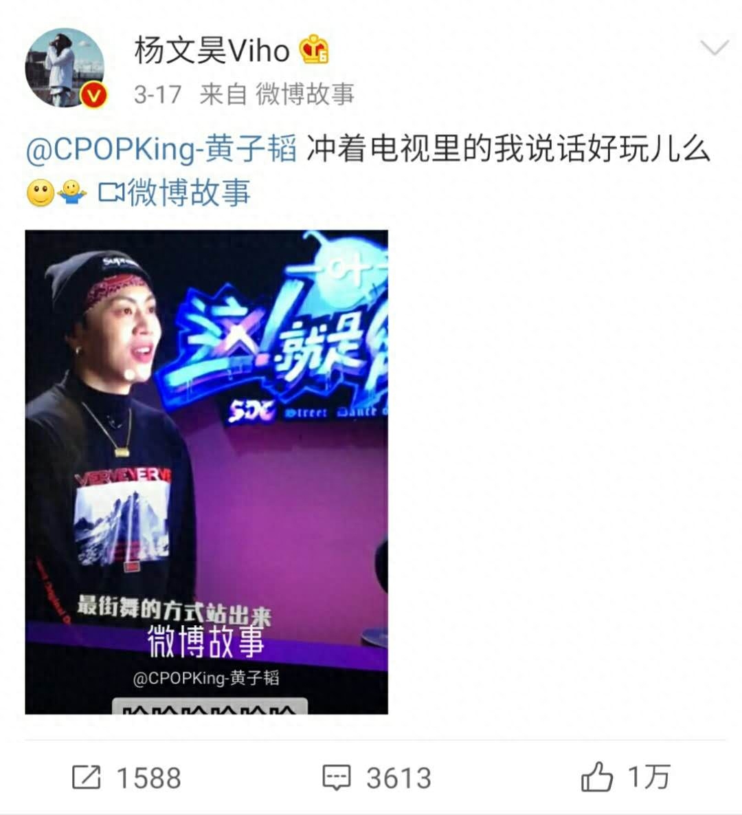 黄子韬发冲着电视里的杨文昊说话的微博故事,杨文昊在微博上@他,黄子韬叫他去看看自己吐槽谢晓飞和秦天宇时的热乎劲儿。