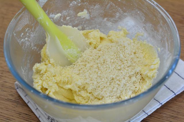 7.喝 用刮刀切拌均匀,倒入甜品杏仁粉;