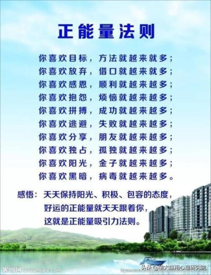 从心理学的视角看“正能量”,是提供一种新的认知方式或者视角,让我们可以看到自已的优势和长处,并不断发挥它们,从而减低或抵消掉那些负性的情绪、缺点和消极的情感,激发我们能够更加的积极向上的动力,对生活充满希望,对人间充满爱的思想情感。同时也表达着我们的渴望,以及我们的期待。