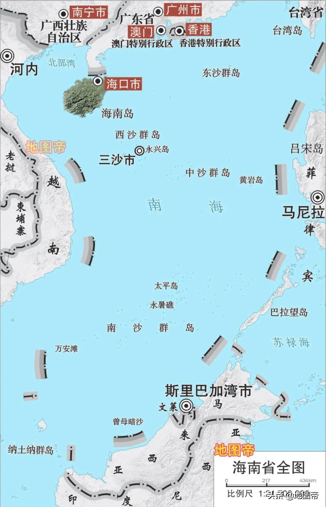 2012年,海南省三沙市成立,辖西沙群岛、中沙群岛、南沙群岛的岛礁及其海域(东沙群岛属广东省汕尾市)。