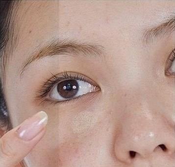 4. 打底。取少量粉底液,在两颊各点三点,均匀抹开。眼睛周围同样操作。