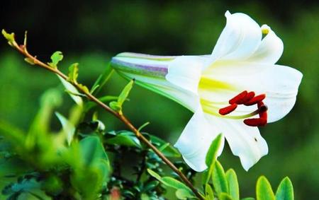 野百合茎杆直立,叶形似柳叶,稍大;花形似喇叭,倒挂如铃铛,色洁白,每年的4一6月开花,具有很高的观赏价值。春天,人们常将其从山里挖回来,植于庭院做观赏花卉。
