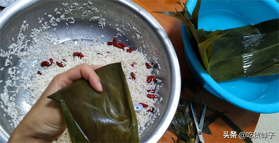 取两片粽叶,将一头的硬角剪掉,把两片粽叶平铺,然后对折,形成一个漏斗,尖角处要重叠一点,以免漏米,然后加入糯米和馅料,不要太满,留一点空隙,然后用两手按出一个三角形,把粽叶折下来,完全盖住,整理好三个角,用线绳将粽子捆起来,一定不要捆得太松,否则容易煮开。