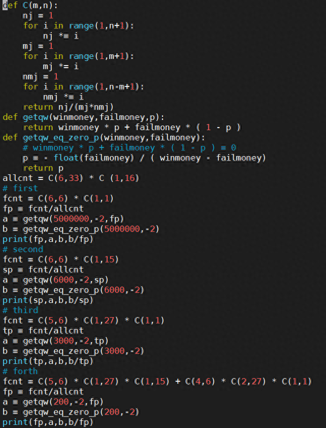 所以我们有必要单独计算各种获奖概率和数学期望。在33个红球中选6个,在16个蓝球中选1个,用组合数来进行计算,就是C(6,33)C(1,16)=1107568×16=17721088。