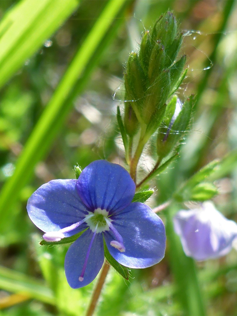 弹指婆婆纳是自然生长的田里、路旁的杂草,从春天到夏天开深蓝色的小花。干燥后的花,一方面可以当治疗皮肤粗操和喉咙痛的药,另一方面,在爱尔兰还把它佩挂在衣服上,驱除厄运。因此它的花语是“除厄”。