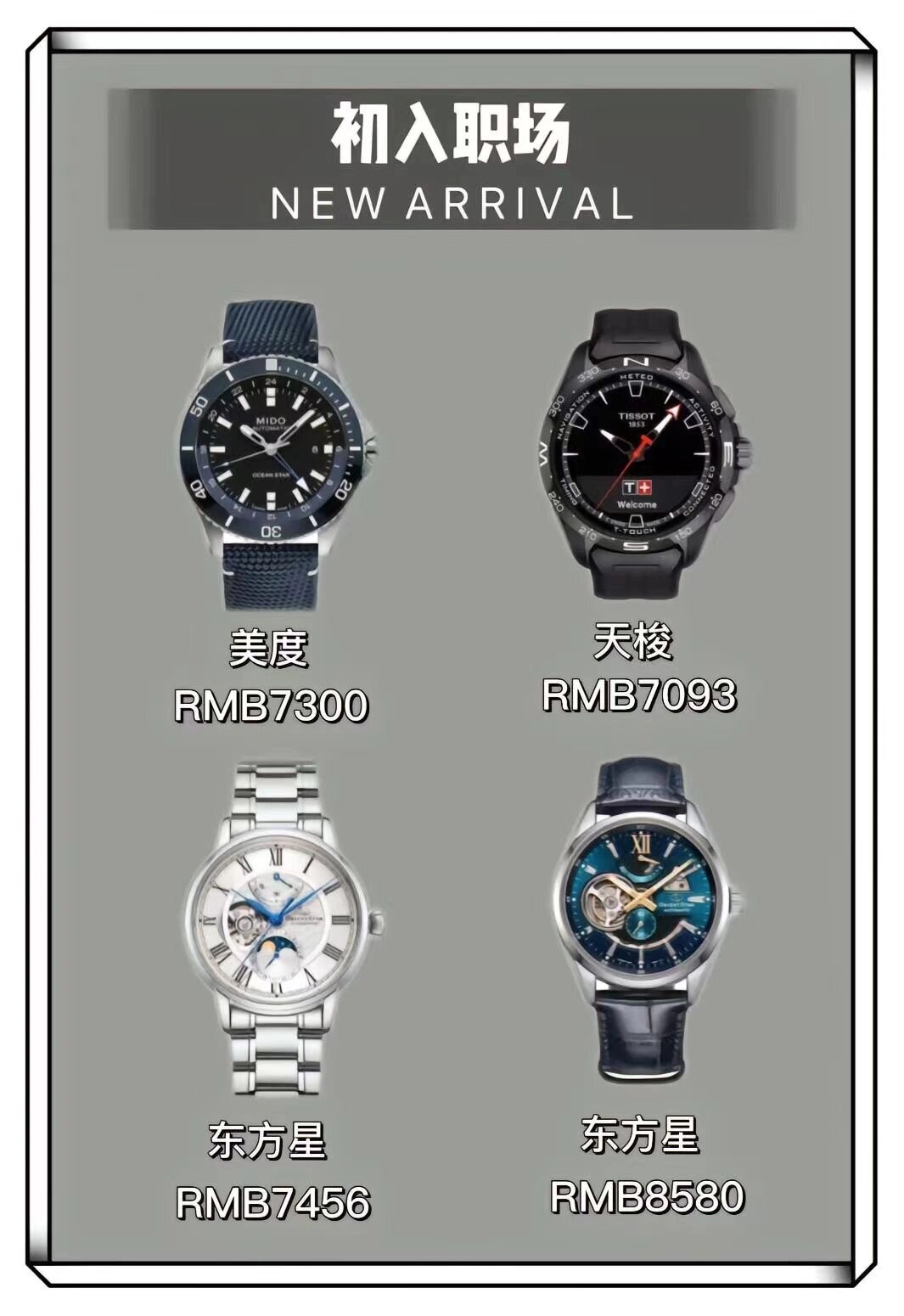 1.初入职场的男士通常会选择价格适中的经济型手表,如美度、天梭等品牌。这些手表常常以简洁、耐用的设计为主,适合日常工作和社交场合佩戴。
