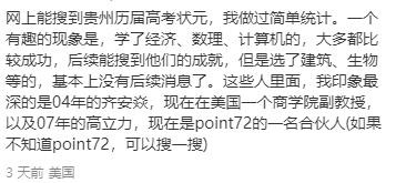 还有一位美国的网友留言:“网上能搜到贵州历届高考状元,我做过简单统计。一个有趣的现象是,学了经济、数理、计算机的,大多都比较成功,后续能搜到他们的成就,但是选了建筑、生物等的,基本上没有后续消息了。这些人里面,我印象最深的是04年的齐安焱,现在在美国一个商学院副教授,以及07年的高立力,现在是point72的一名合伙人(如果不知道point72,可以搜一搜)。”
