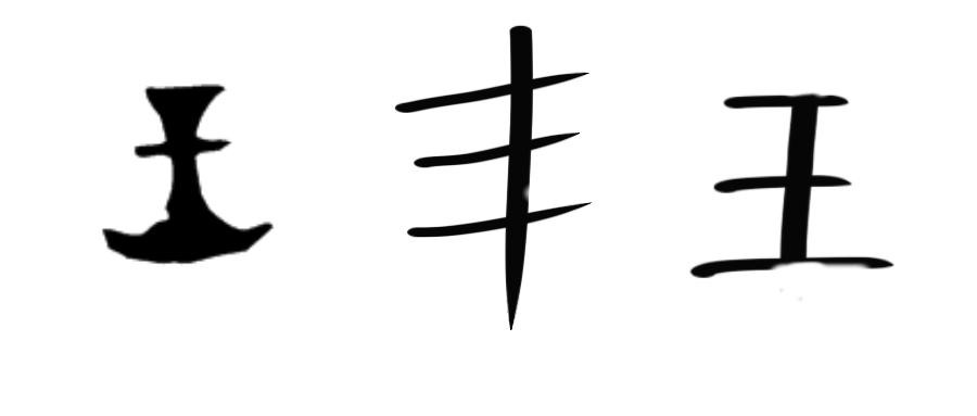 首先我们来看看王字的甲骨文,左边这个看起来像个斧头就是王字的甲骨文,斧头在古代是权力的象征。而中间这个就是玉的甲骨文,看起来像是用一根绳子将玉石串起来,而最右边这个是玉的金文。