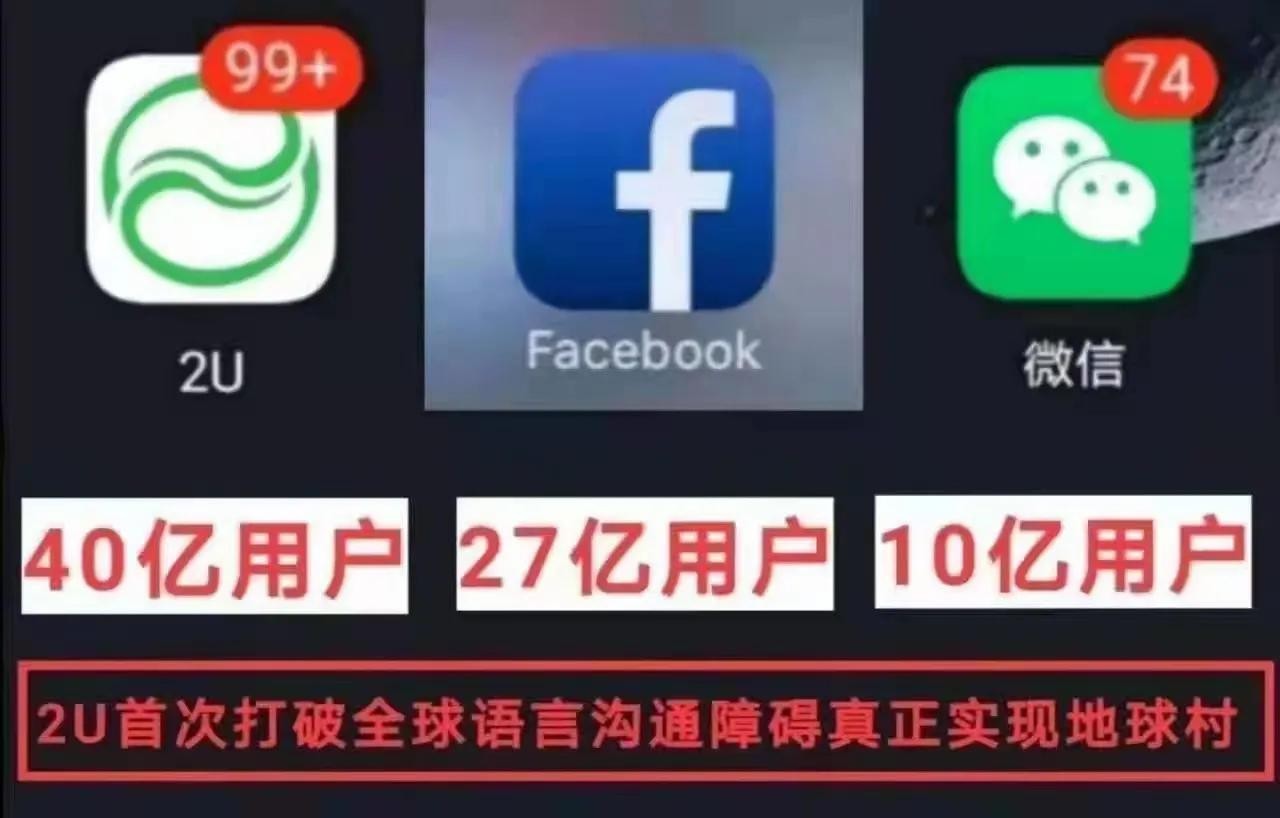 2U是中国与世界团队联合研发的5G社交软件,是全世界的聊天软件,全球人都可以免费使用,是世界级的大平台,其价值由36大应用场景和人、金、物、科技、健康五本位支撑(新能源➕抗疫药)!2U聊天APP包括全球社交、智能翻译、国际商城、新闻、游戏、音乐、视频、直播、AI指挥系统等等板块,陆续开发升级中……