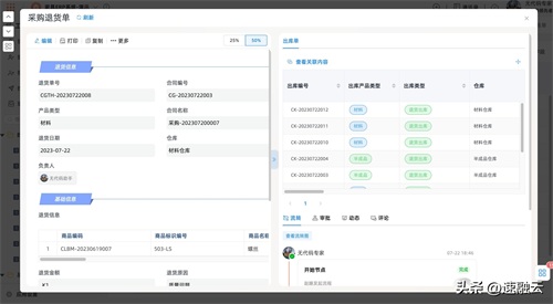 比如采购验收产品不合格,需进行退货处理,在采购退单选择订单、产品等,系统自动计算退货金额,根据退款流程进展,实时更新已退款金额和退款状态,并自动同步更新采购订单。