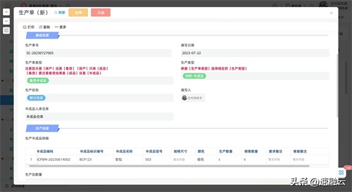 之前需员工在车间统计数据后再重复录入到系统,效率低下;现在车间接到生产计划后,可手机扫描或在手机快速发起生产单申请,根据生产需求选择生产类型,记录产品明细、并进行生产排期和工艺等。
