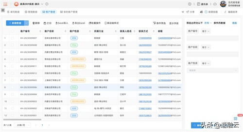 也可根据需求,自定义设置多条件快速精准查找该客户信息,解决之前在Excel 表只能单一需多次查询的痛点;且根据每个人负责的客户和供应商,系统自动分类整理,比如在「我的客户管理」,不同人只能查看管理自己的客户,无法查看他人的客户,提升效率同时也能保证客户数据安全。