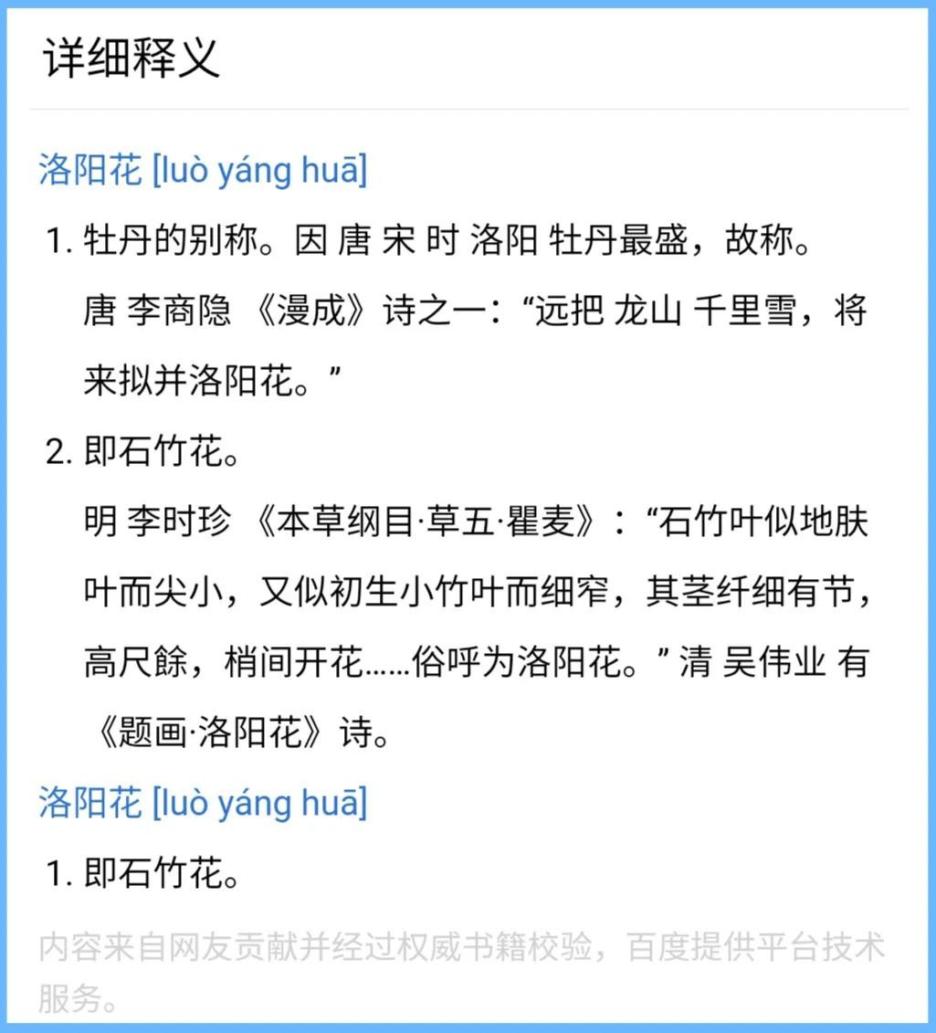 在网上搜索洛阳花一词的含义时,见到以下结果: