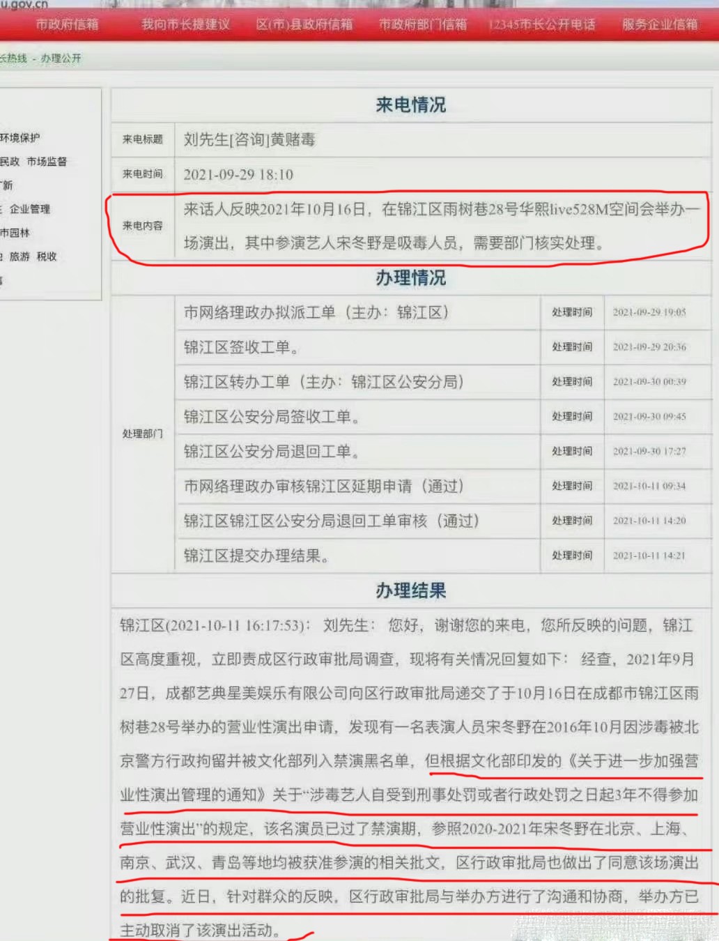据悉,本来宋冬野10月16日会在成都出席一场音乐活动,在前不久主办方公布了嘉宾阵容之后,有网友向相关监管部门进行了举报。