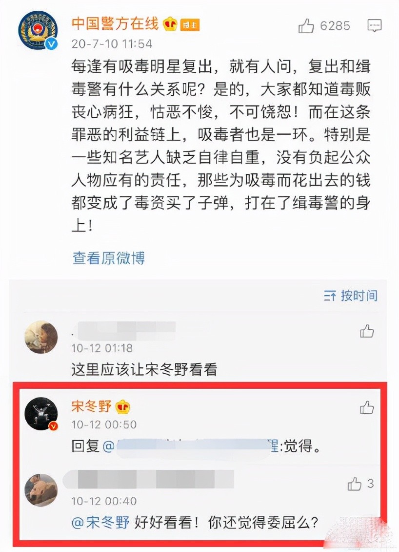 有网友在“中国警方在线”发布于2020年的一条讲述“吸毒明星复出和缉毒警之间的关系”的微博下问他:“你还觉得委屈吗?” 宋冬野回复:觉得。