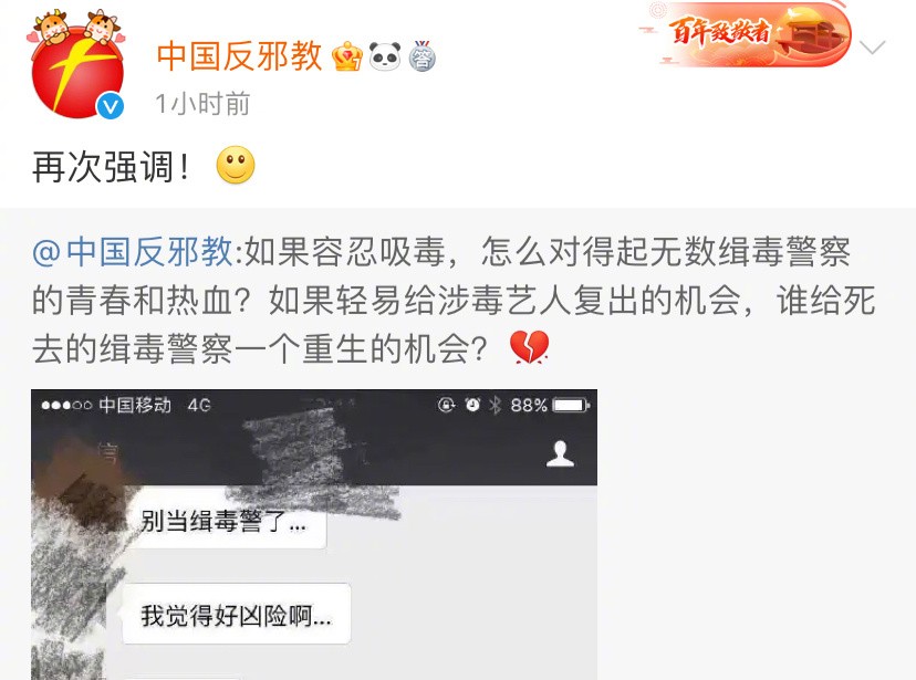 中国反邪/教发文:“如果容忍吸毒,怎么对得起无数缉毒警察的青春和热血?如果轻易给涉毒艺人复出的机会,谁给死去的缉毒警察一个重生的机会?”