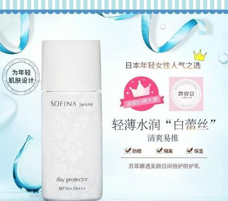 索菲娜的防晒真的是学生之光,防晒力强,而且价格不高!尤其透美颜系列,价格更便宜。分为蓝蕾丝和白蕾丝,蓝蕾丝追求美白,白蕾丝更保湿,但是油皮使用却一点也不油腻!同时还防水抗汗,微微的润色也很自然。