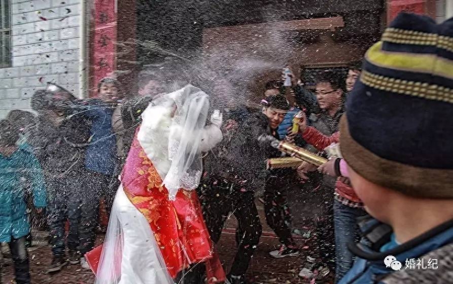 ③ 还要注意安全问题,尽量高于新人头顶喷,不能向新人身上喷。礼花弹的力量很大,不小心打在脸上,会把脸打破或打肿。