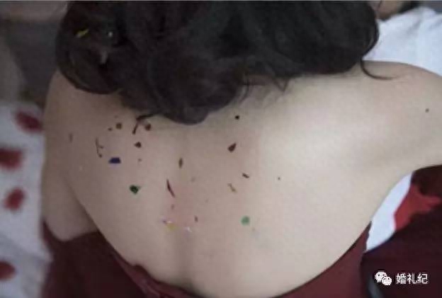 而且这种产品质量不稳定,有的会严重掉色, 特别是在夏天使用,纸屑喷洒到新人和来宾的衣服里面,与汗水混合,掉色的话容易会把衣服染色。