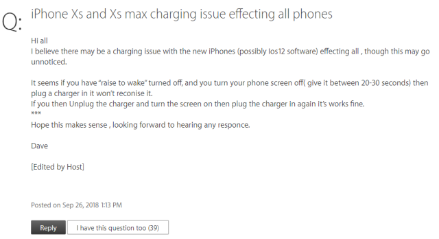9月24号,昵称为xMASTIFFSx的iPhone用户在苹果官方论坛发帖称,自己的iPhone XS Max在使用Lightning 充电线时出现无法充电的情况,但放下手机再拿起,屏幕亮起之后手机又显示正在充电中,无法确定是硬件问题还是软件系统问题。