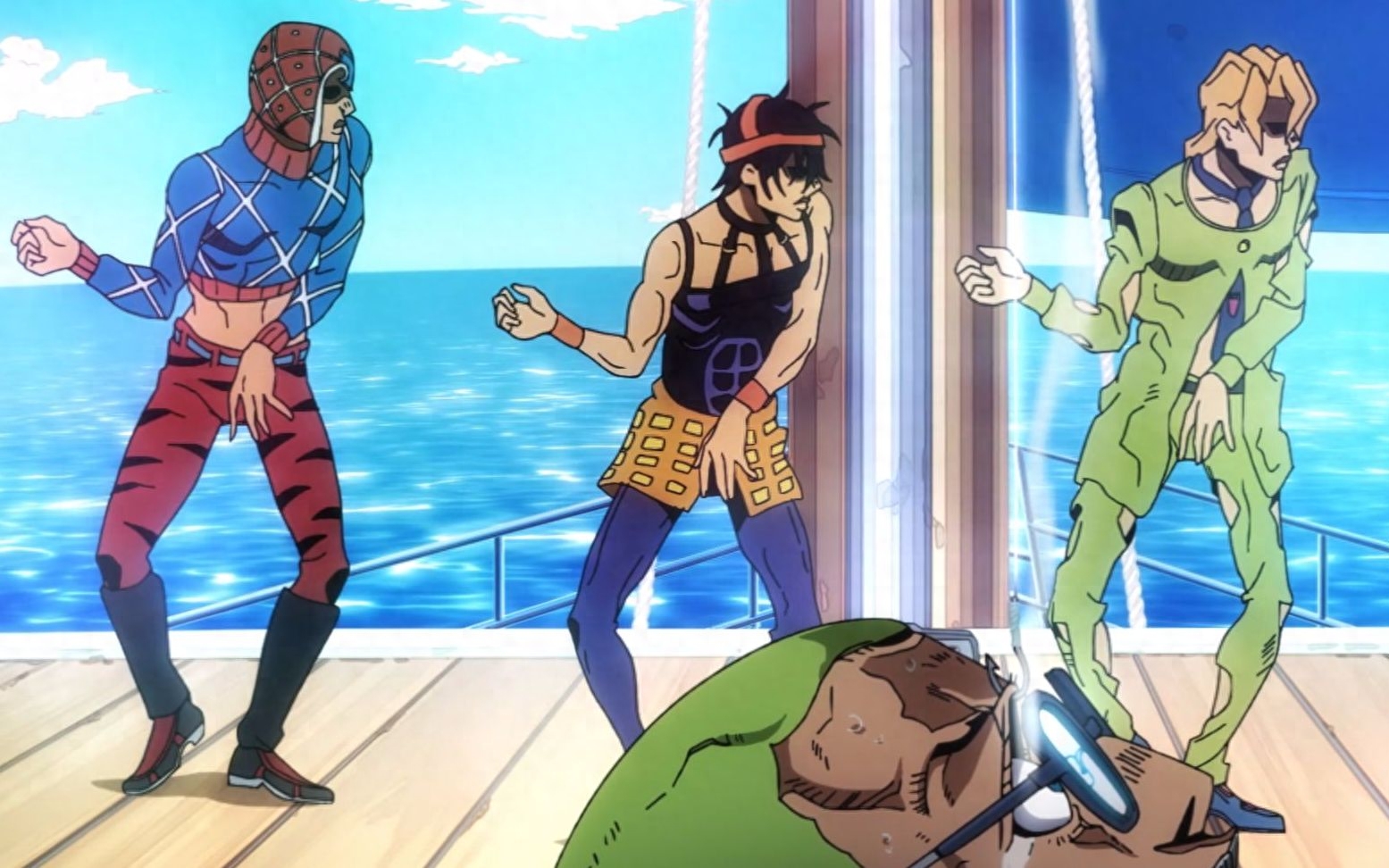 布加拉提小队在游艇上遇袭,经过一番战斗后将敌人制伏,由于敌人拒不交出情报,于是米斯达就用鱼钩将其头部挂在船上,并在其眼部放镜片。随后米斯达、纳兰迦和福葛三人开始在船头蹦迪,嘲讽敌人。