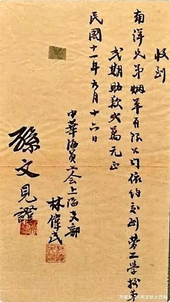 1922年,中山先生做见证人的“南洋兄弟烟草公司捐赠劳工学校助学款20000元收到条”。