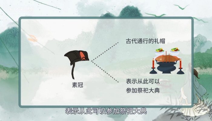 最后加上红中带黑的素冠,是古代通行的礼帽,表示从此可以参加祭祀大典。