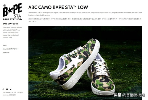 日本知名潮流品牌A BATHINGAPE®猿人头为纪念 BAPE STA 鞋款20周年,再度推出BAPE STA 20周年的别注配色,将经典的迷彩猿颜应用在鞋款设计之上,共推出绿,蓝及粉红三种配色。