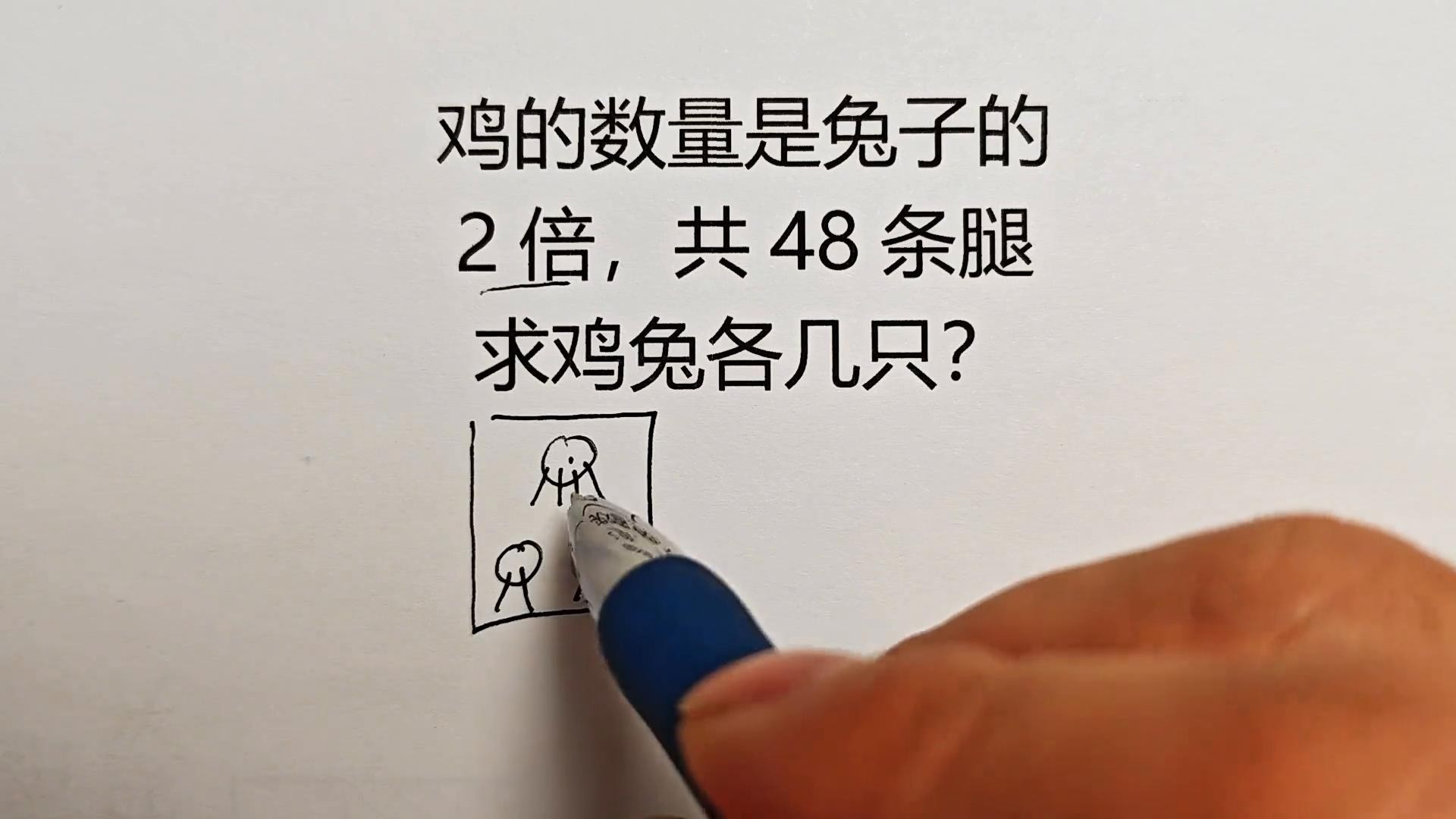 但凡看到有倍数的鸡兔同笼问题,一定使用打包法。都知道一只兔子是不是有四条腿,而一只鸡是由两条腿。根据题意说鸡的数量是兔子的二倍,这里有一只兔子是不是就得给它配上两只鸡?所以就把它打成一个包当做一个整体来看待。