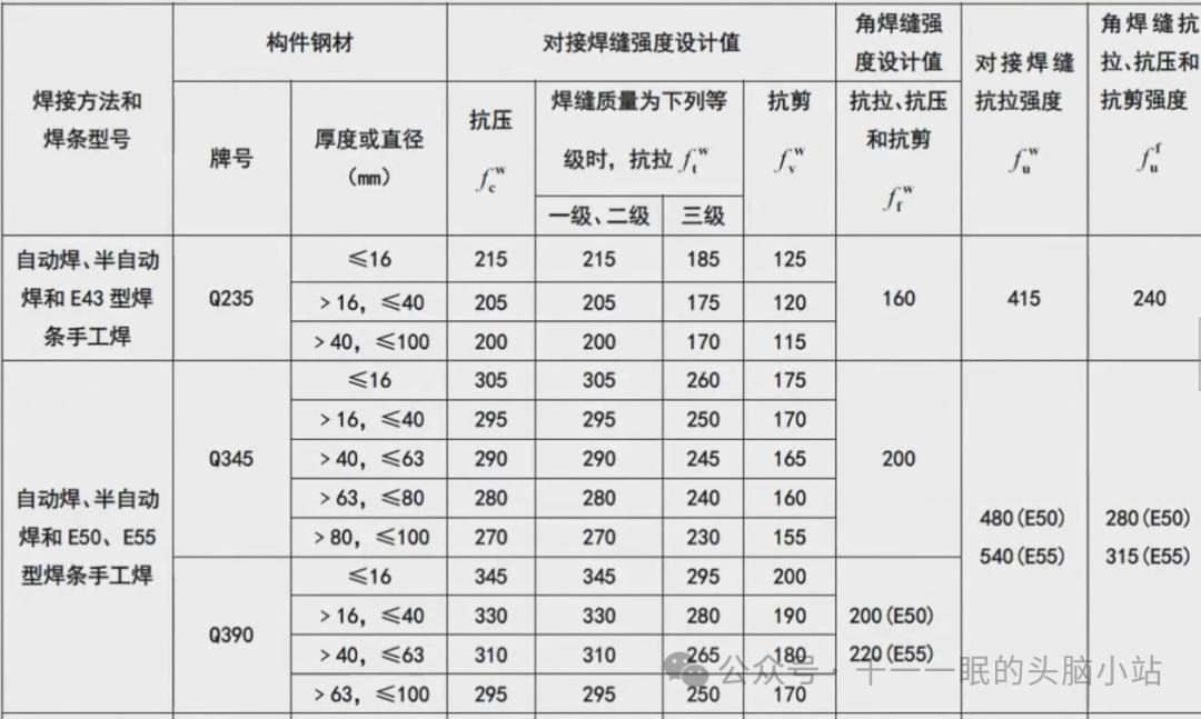 焊接强度与钢材牌号、厚度有关,角焊缝拉、压、剪强度相同;对接焊缝抗剪强度小于压、拉强度;对接焊缝的抗剪强度小于角焊缝,拉、压强度大于角焊缝。